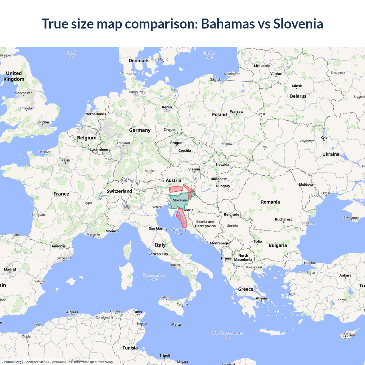 The map above outlines the borders of the Bahamas and Slovenia but is not accurate for size comparison because it's a 2d map with Mercator projection that distorts territories near the poles. The farther a country is from the equator, the more magnified it appears. More about country size projections.