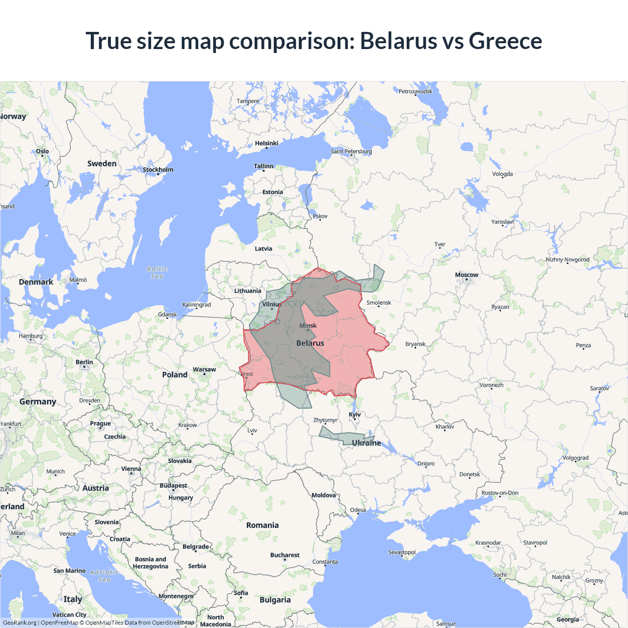 The map above outlines the borders of Belarus and Greece but is not accurate for size comparison because it's a 2d map with Mercator projection that distorts territories near the poles. The farther a country is from the equator, the more magnified it appears. More about country size projections.