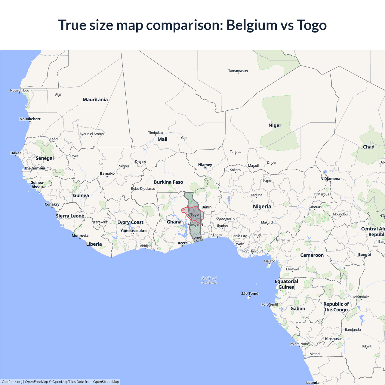 The map above outlines the borders of Belgium and Togo but is not accurate for size comparison because it's a 2d map with Mercator projection that distorts territories near the poles. The farther a country is from the equator, the more magnified it appears. More about country size projections.