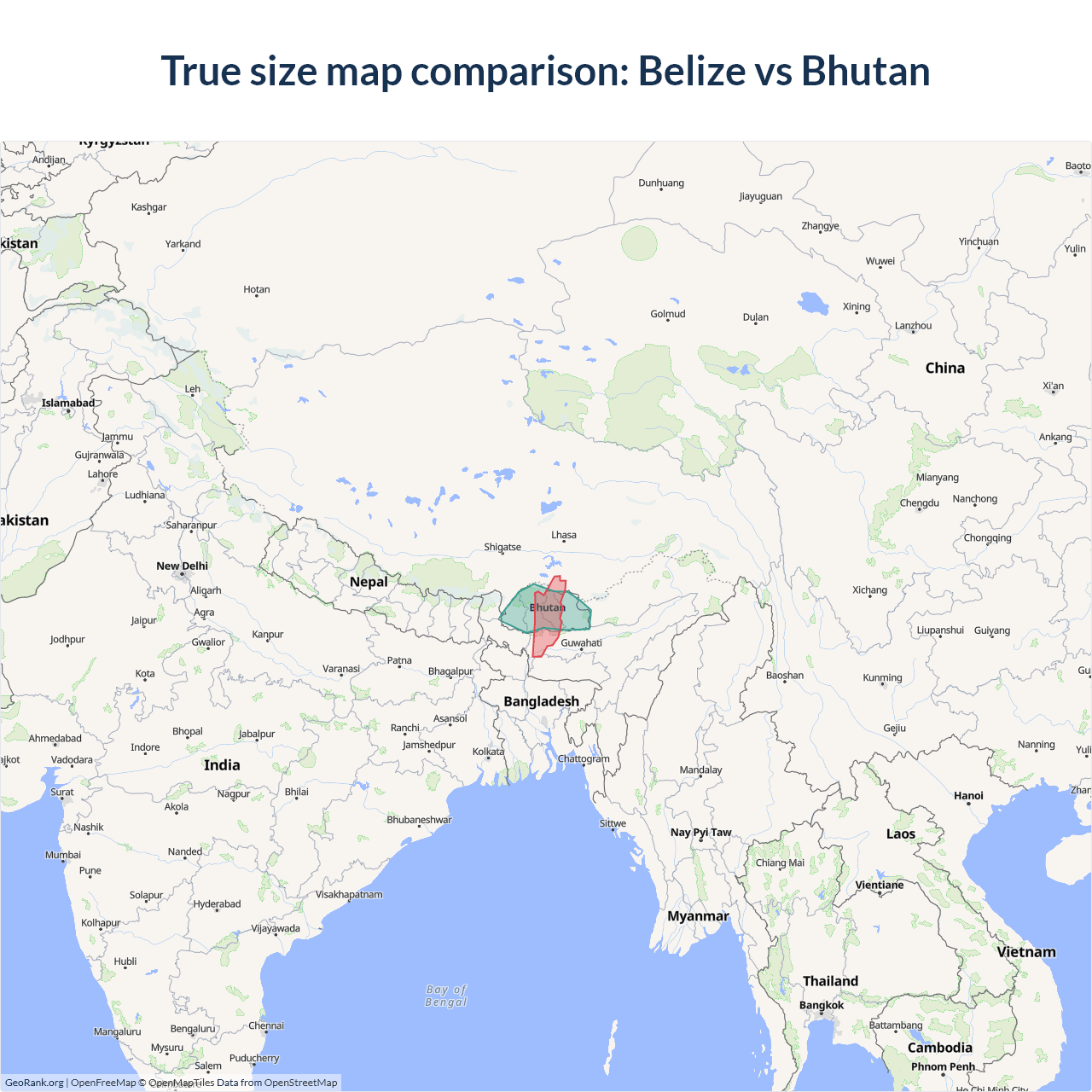 The map above outlines the borders of Belize and Bhutan but is not accurate for size comparison because it's a 2d map with Mercator projection that distorts territories near the poles. The farther a country is from the equator, the more magnified it appears. More about country size projections.
