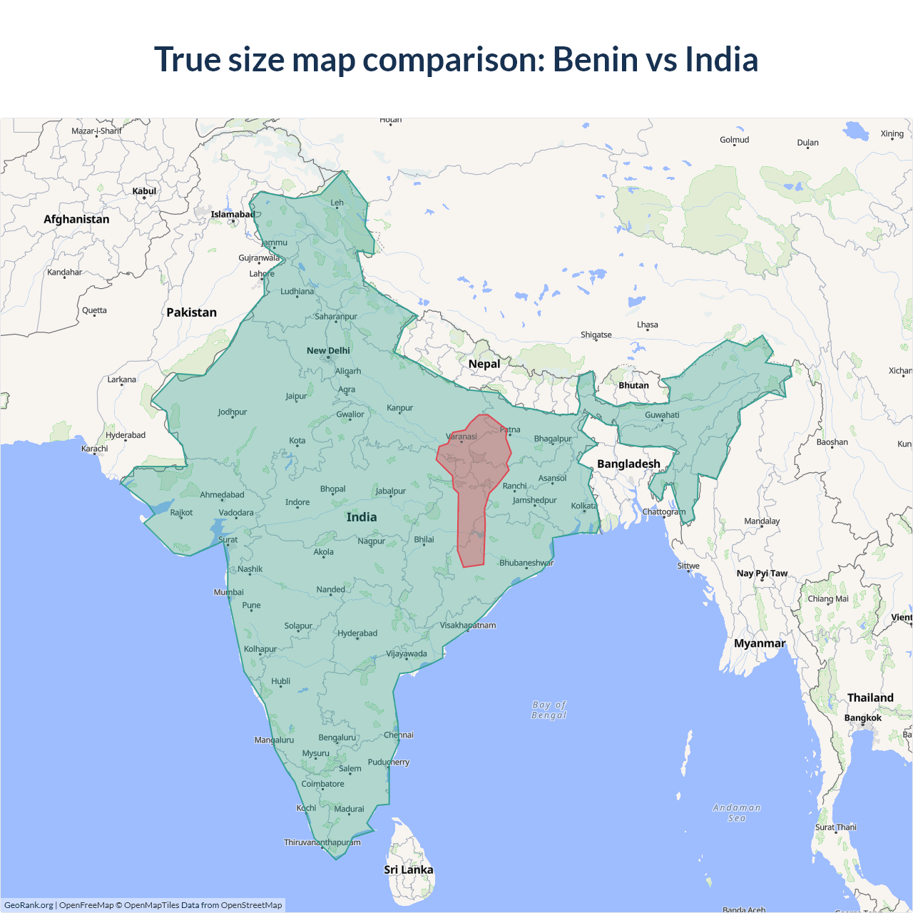 The map above outlines the borders of Benin and India but is not accurate for size comparison because it's a 2d map with Mercator projection that distorts territories near the poles. The farther a country is from the equator, the more magnified it appears. More about country size projections.