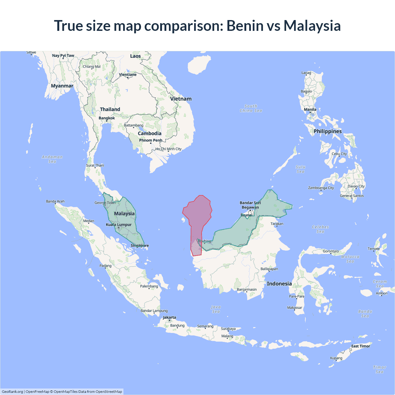 The map above outlines the borders of Benin and Malaysia but is not accurate for size comparison because it's a 2d map with Mercator projection that distorts territories near the poles. The farther a country is from the equator, the more magnified it appears. More about country size projections.
