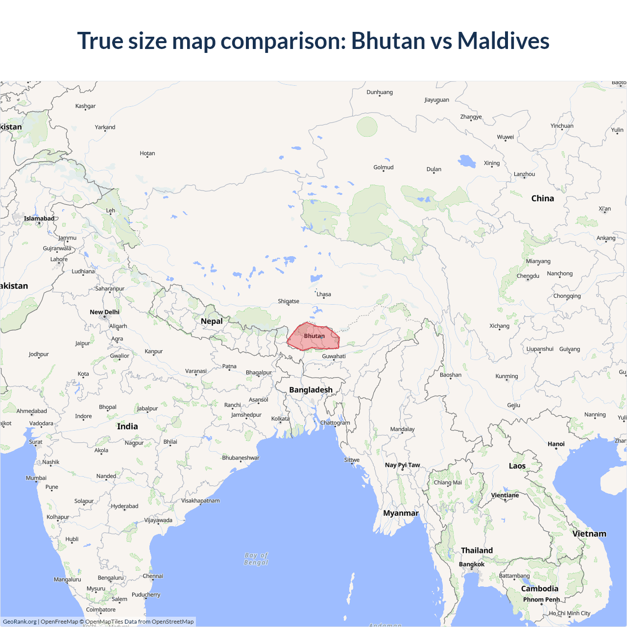 The map above outlines the borders of Bhutan and Maldives but is not accurate for size comparison because it's a 2d map with Mercator projection that distorts territories near the poles. The farther a country is from the equator, the more magnified it appears. More about country size projections.