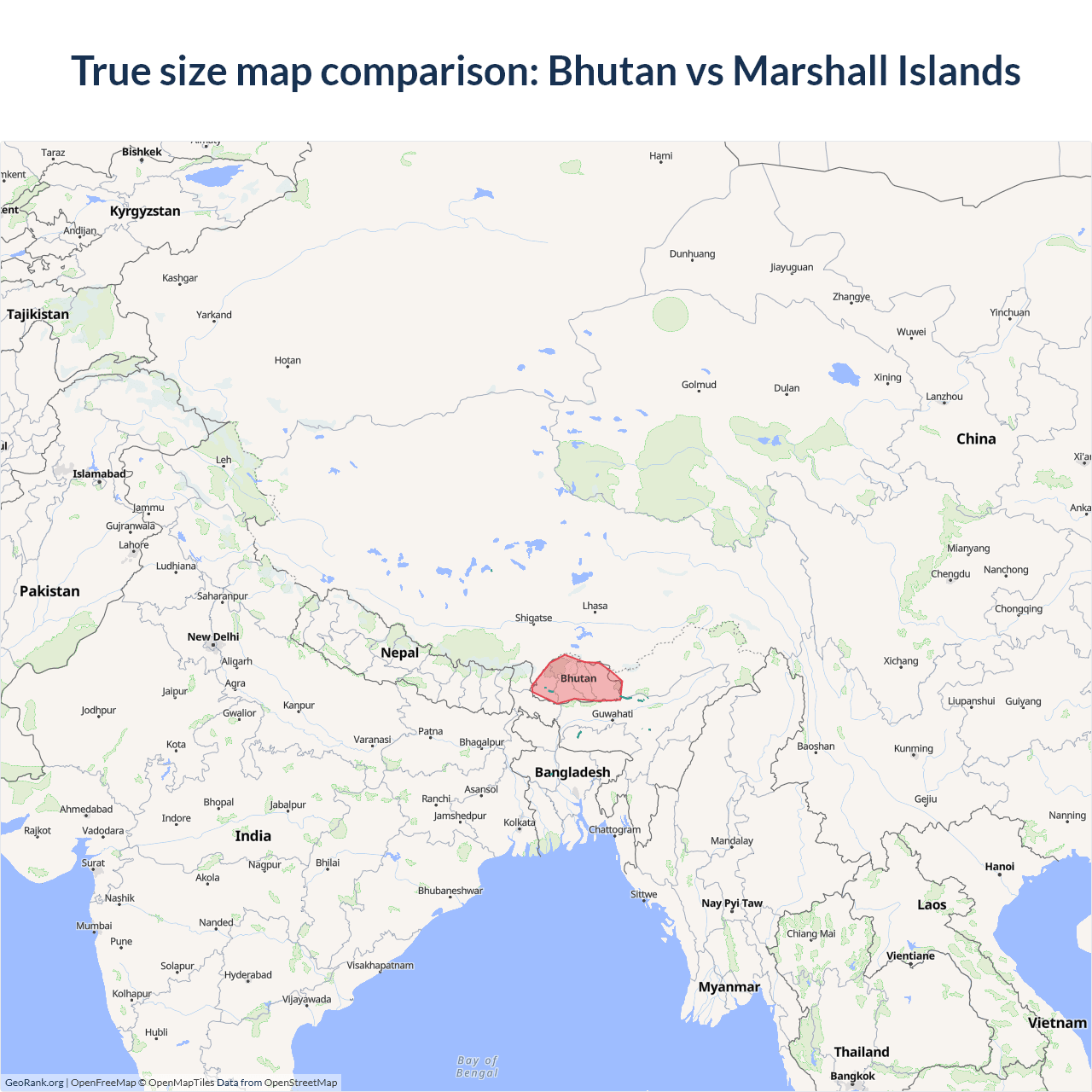 The map above outlines the borders of Bhutan and the Marshall Islands but is not accurate for size comparison because it's a 2d map with Mercator projection that distorts territories near the poles. The farther a country is from the equator, the more magnified it appears. More about country size projections.