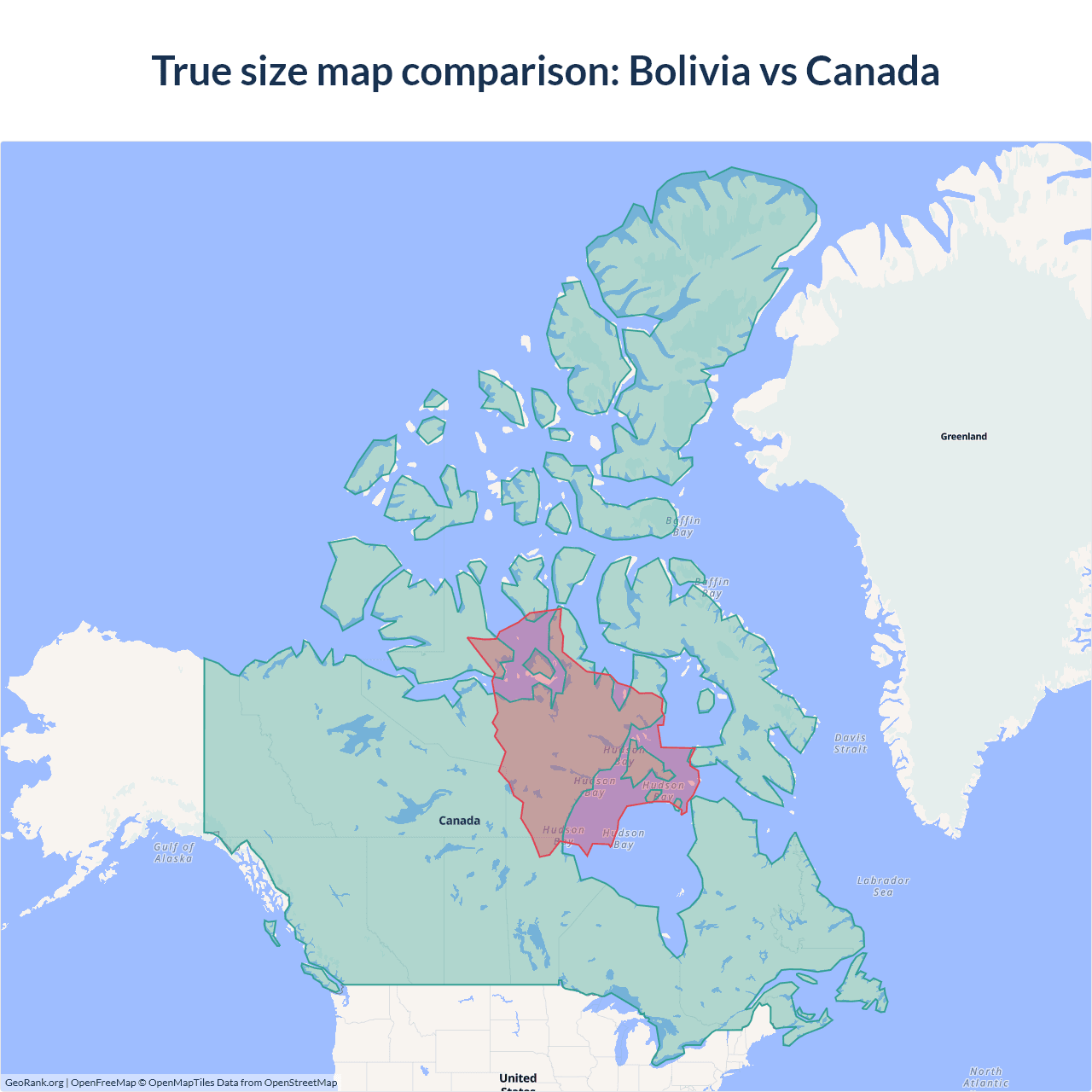 The map above outlines the borders of Bolivia and Canada but is not accurate for size comparison because it's a 2d map with Mercator projection that distorts territories near the poles. The farther a country is from the equator, the more magnified it appears. More about country size projections.