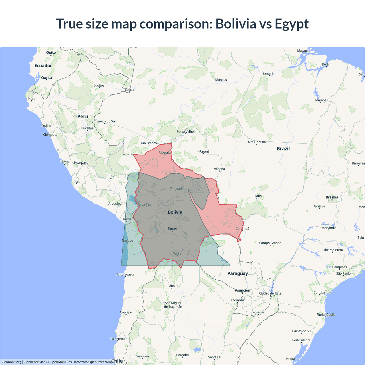 The map above outlines the borders of Bolivia and Egypt but is not accurate for size comparison because it's a 2d map with Mercator projection that distorts territories near the poles. The farther a country is from the equator, the more magnified it appears. More about country size projections.