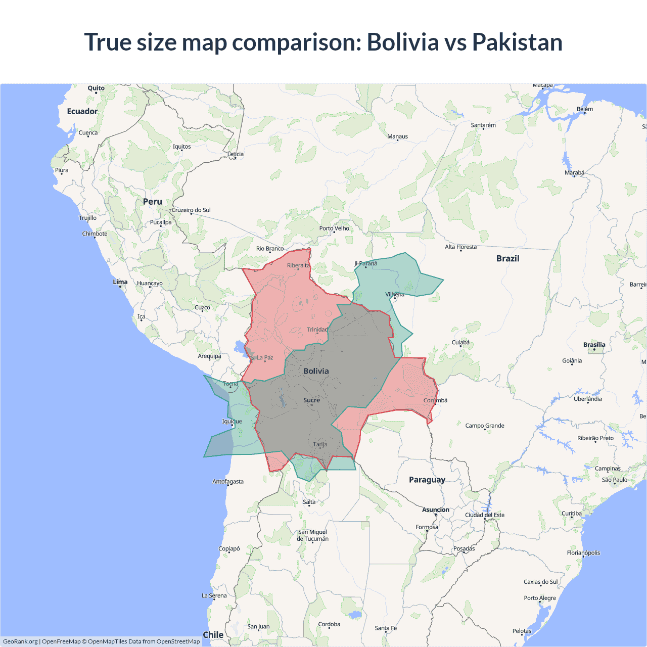 The map above outlines the borders of Bolivia and Pakistan but is not accurate for size comparison because it's a 2d map with Mercator projection that distorts territories near the poles. The farther a country is from the equator, the more magnified it appears. More about country size projections.