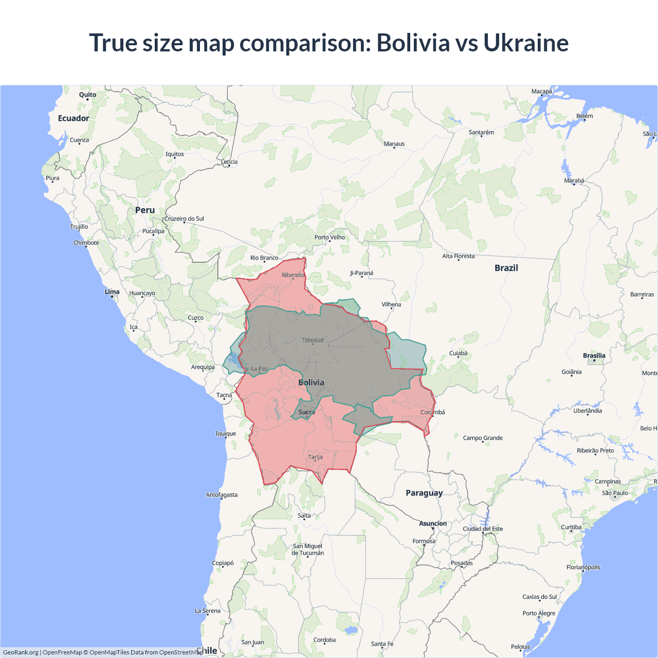 The map above outlines the borders of Bolivia and Ukraine but is not accurate for size comparison because it's a 2d map with Mercator projection that distorts territories near the poles. The farther a country is from the equator, the more magnified it appears. More about country size projections.