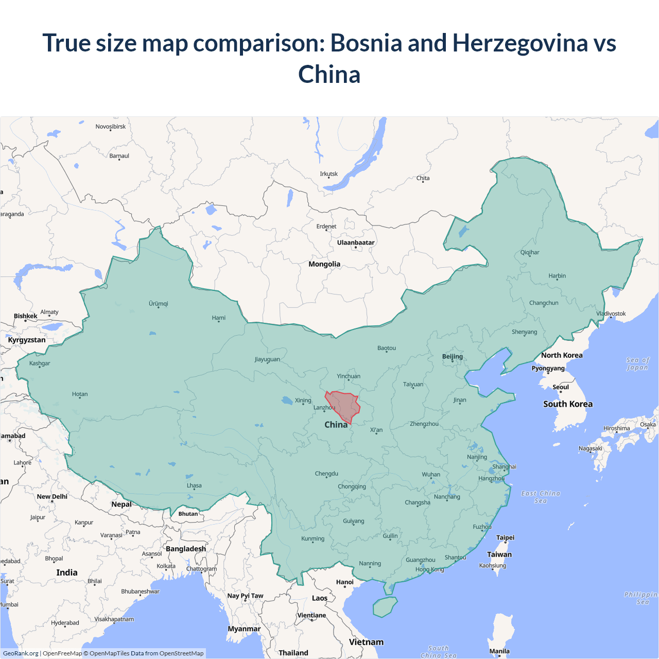The map above outlines the borders of Bosnia and Herzegovina and China but is not accurate for size comparison because it's a 2d map with Mercator projection that distorts territories near the poles. The farther a country is from the equator, the more magnified it appears. More about country size projections.