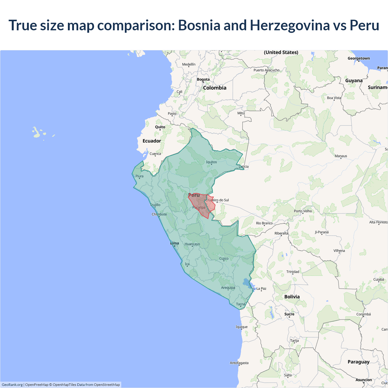 The map above outlines the borders of Bosnia and Herzegovina and Peru but is not accurate for size comparison because it's a 2d map with Mercator projection that distorts territories near the poles. The farther a country is from the equator, the more magnified it appears. More about country size projections.