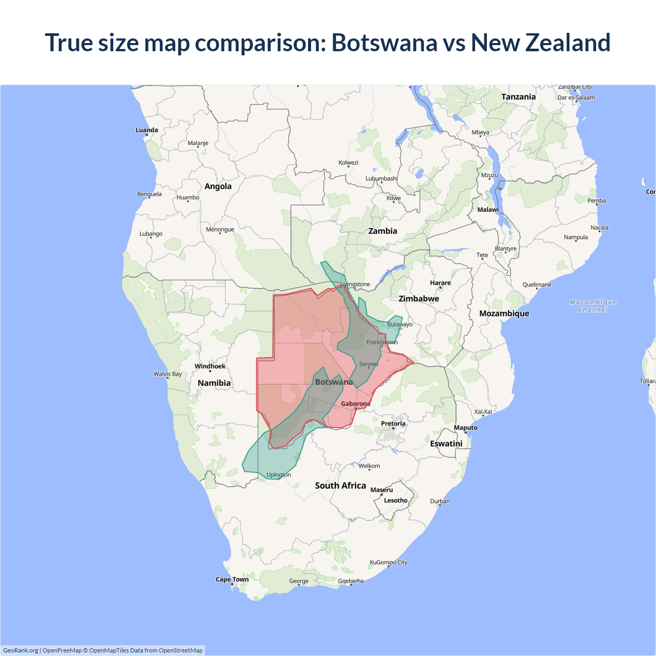 Botswana vs New Zealand size on the map