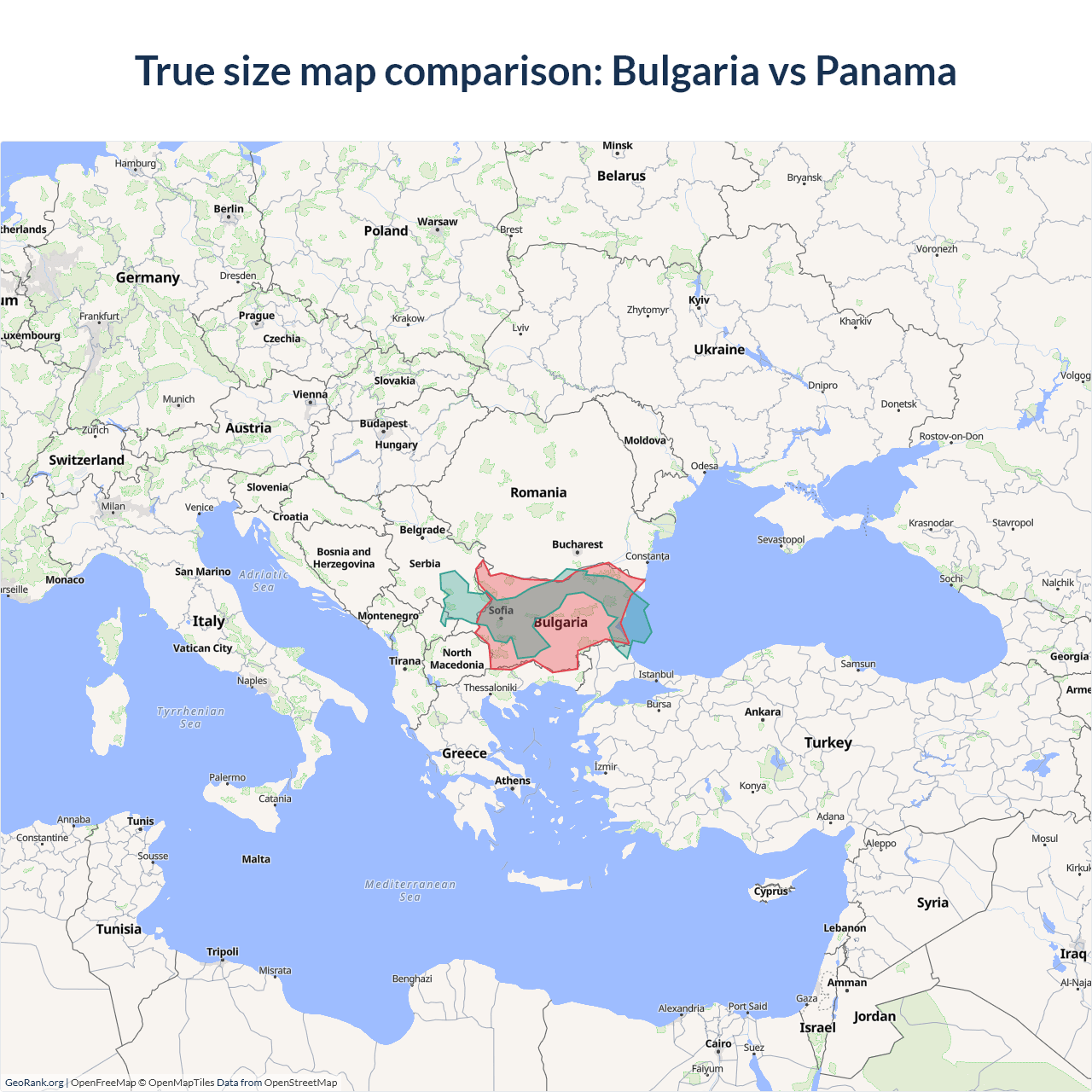 The map above outlines the borders of Bulgaria and Panama but is not accurate for size comparison because it's a 2d map with Mercator projection that distorts territories near the poles. The farther a country is from the equator, the more magnified it appears. More about country size projections.