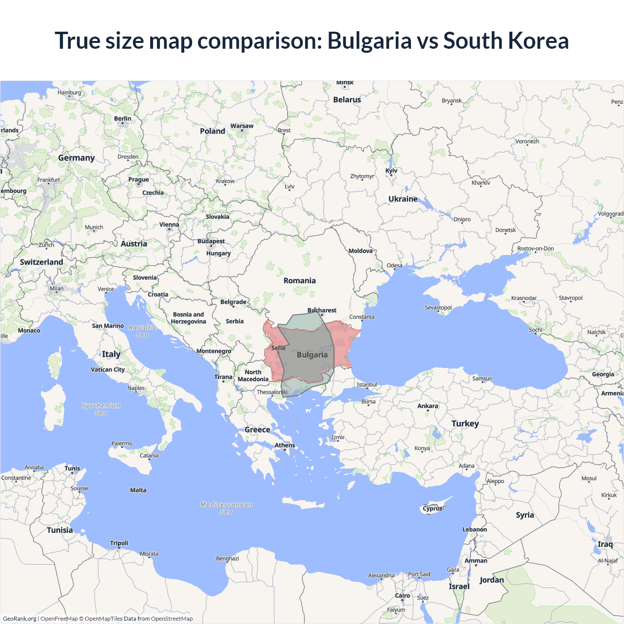 The map above outlines the borders of Bulgaria and South Korea but is not accurate for size comparison because it's a 2d map with Mercator projection that distorts territories near the poles. The farther a country is from the equator, the more magnified it appears. More about country size projections.