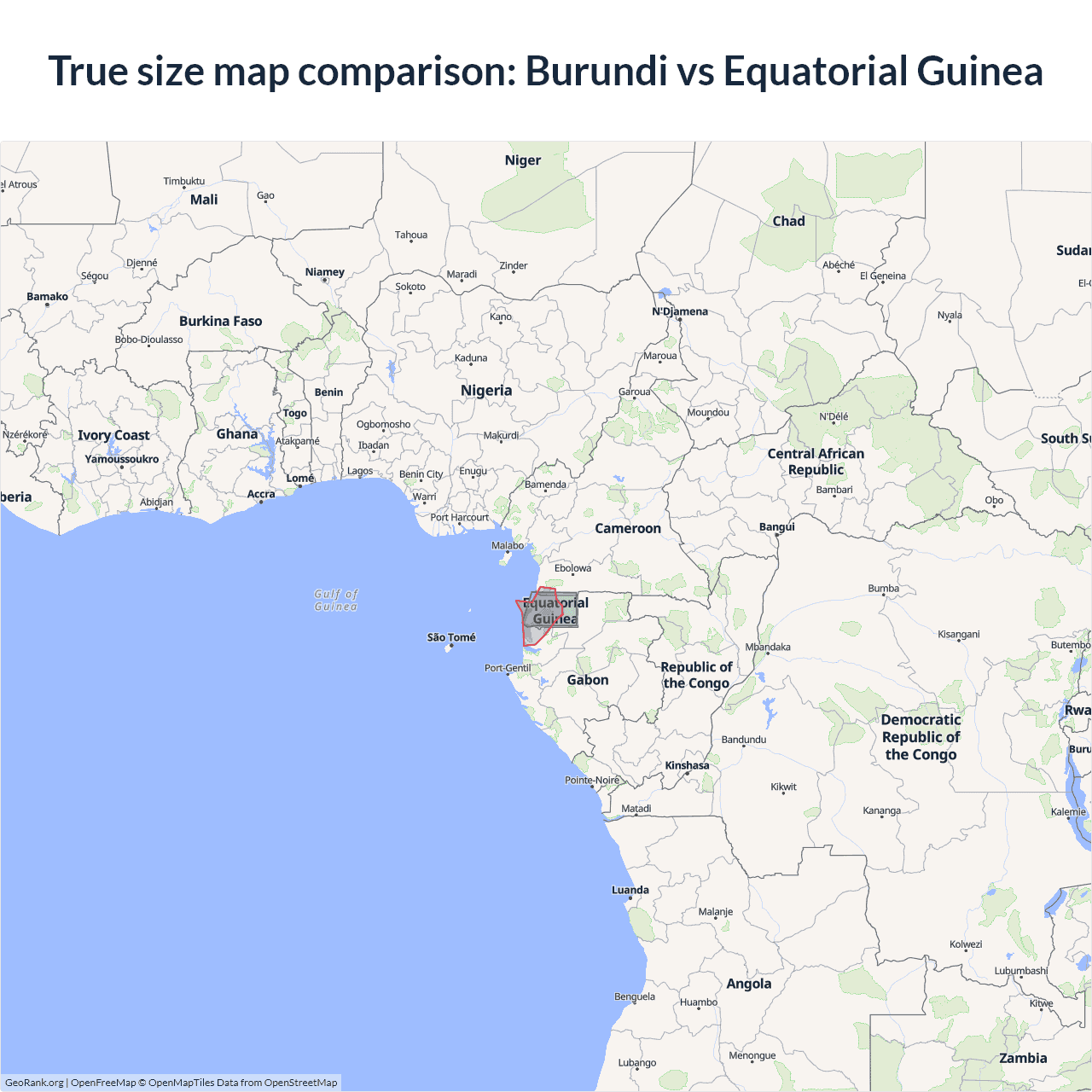 The map above outlines the borders of Burundi and Equatorial Guinea but is not accurate for size comparison because it's a 2d map with Mercator projection that distorts territories near the poles. The farther a country is from the equator, the more magnified it appears. More about country size projections.