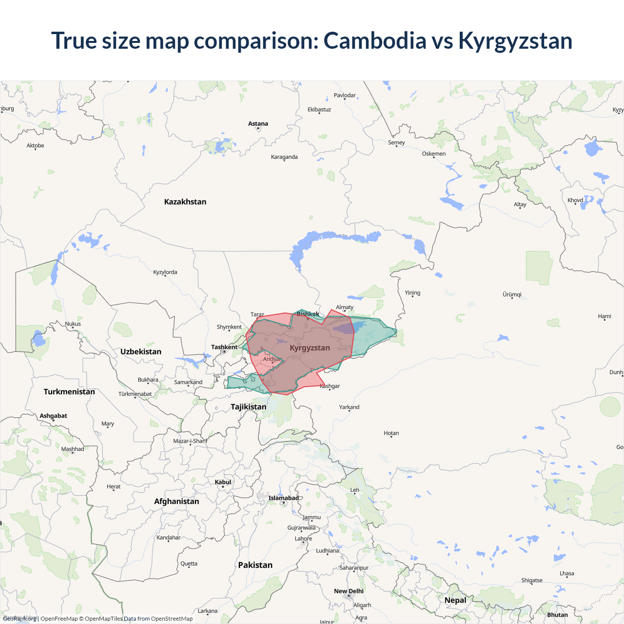 The map above outlines the borders of Cambodia and Kyrgyzstan but is not accurate for size comparison because it's a 2d map with Mercator projection that distorts territories near the poles. The farther a country is from the equator, the more magnified it appears. More about country size projections.