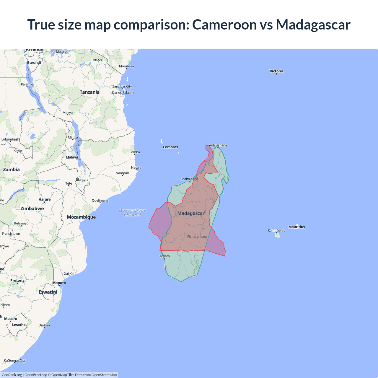The map above outlines the borders of Cameroon and Madagascar but is not accurate for size comparison because it's a 2d map with Mercator projection that distorts territories near the poles. The farther a country is from the equator, the more magnified it appears. More about country size projections.