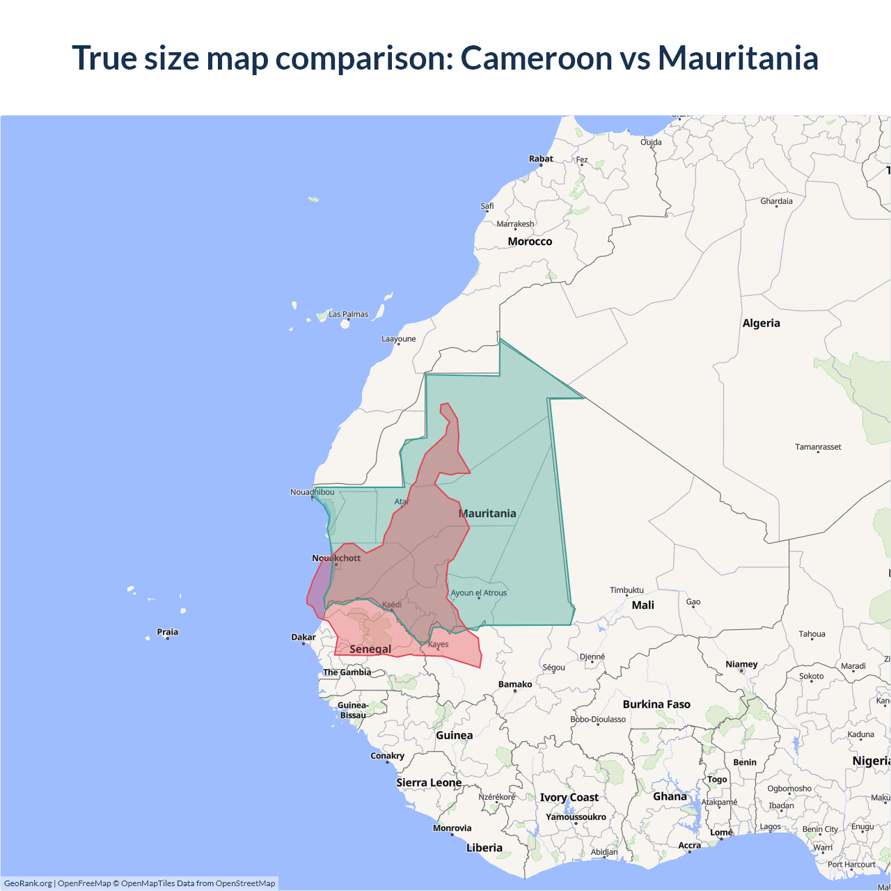The map above outlines the borders of Cameroon and Mauritania but is not accurate for size comparison because it's a 2d map with Mercator projection that distorts territories near the poles. The farther a country is from the equator, the more magnified it appears. More about country size projections.