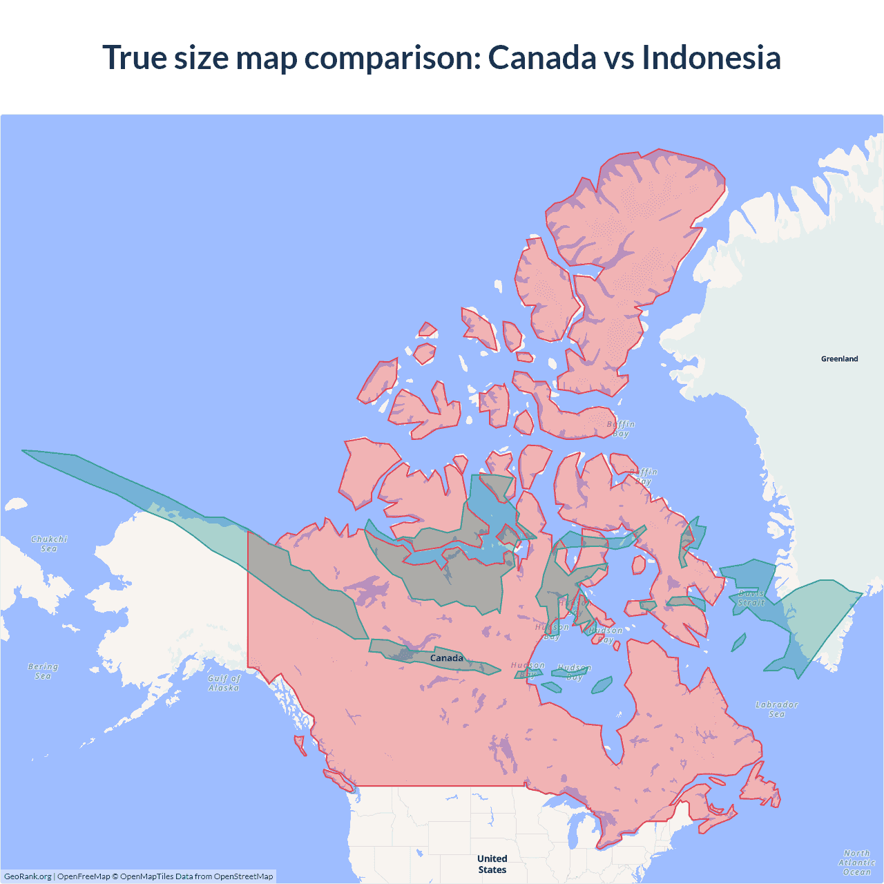 The map above outlines the borders of Canada and Indonesia but is not accurate for size comparison because it's a 2d map with Mercator projection that distorts territories near the poles. The farther a country is from the equator, the more magnified it appears. More about country size projections.