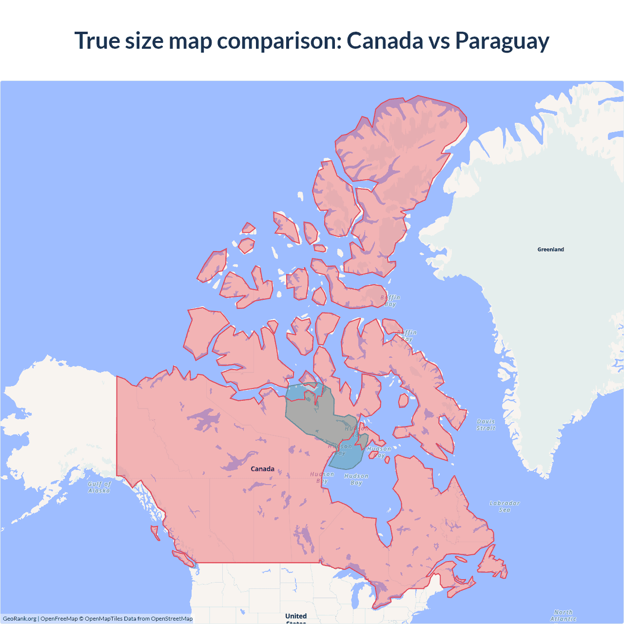 The map above outlines the borders of Canada and Paraguay but is not accurate for size comparison because it's a 2d map with Mercator projection that distorts territories near the poles. The farther a country is from the equator, the more magnified it appears. More about country size projections.
