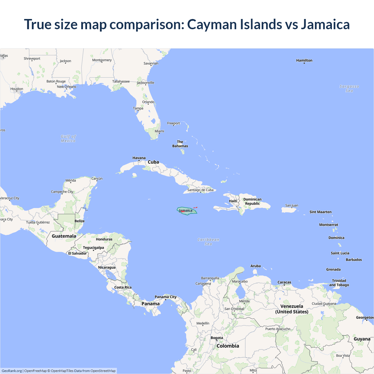 The map above outlines the borders of the Cayman Islands and Jamaica but is not accurate for size comparison because it's a 2d map with Mercator projection that distorts territories near the poles. The farther a country is from the equator, the more magnified it appears. More about country size projections.
