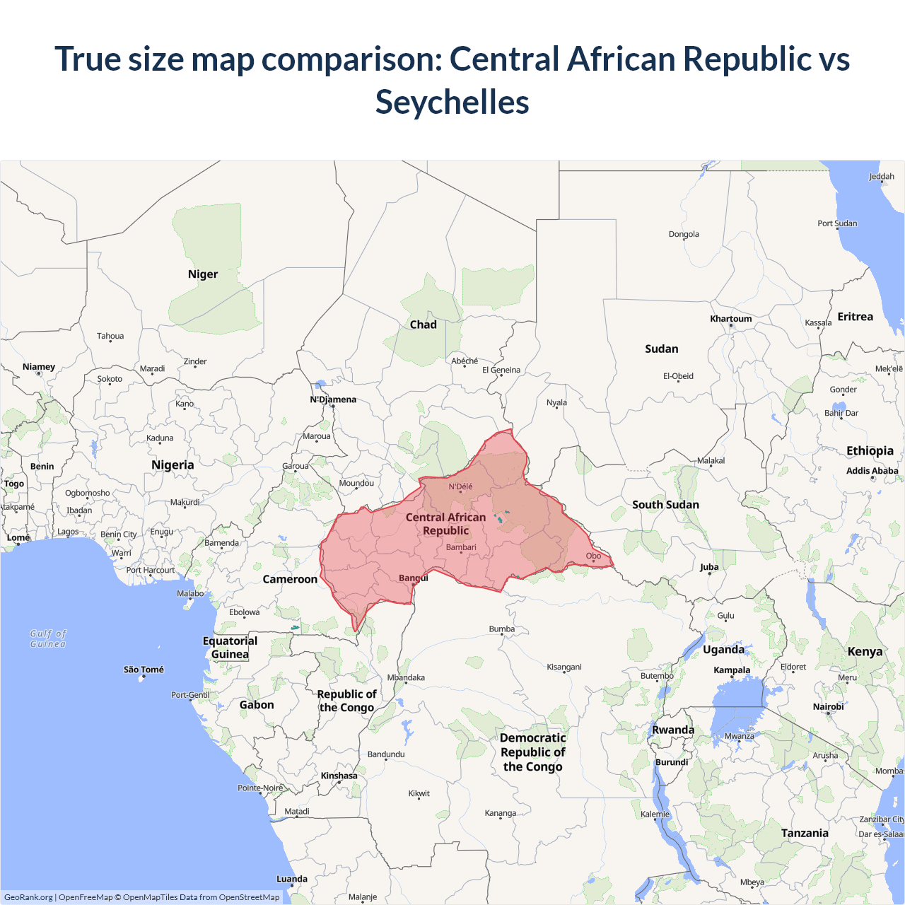 The map above outlines the borders of the Central African Republic and the Seychelles but is not accurate for size comparison because it's a 2d map with Mercator projection that distorts territories near the poles. The farther a country is from the equator, the more magnified it appears. More about country size projections.
