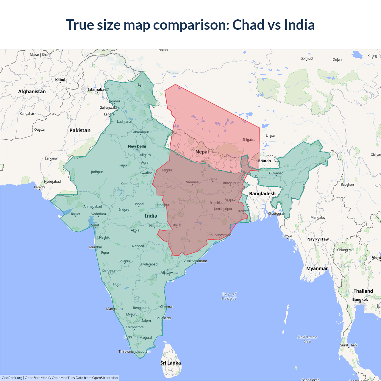 The map above outlines the borders of Chad and India but is not accurate for size comparison because it's a 2d map with Mercator projection that distorts territories near the poles. The farther a country is from the equator, the more magnified it appears. More about country size projections.