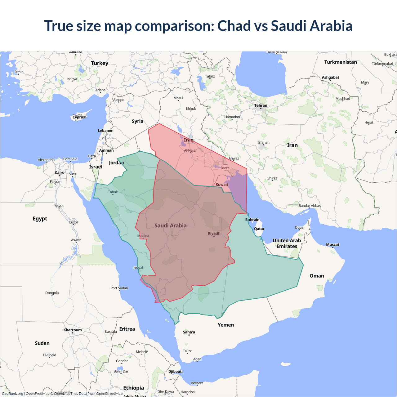 The map above outlines the borders of Chad and Saudi Arabia but is not accurate for size comparison because it's a 2d map with Mercator projection that distorts territories near the poles. The farther a country is from the equator, the more magnified it appears. More about country size projections.
