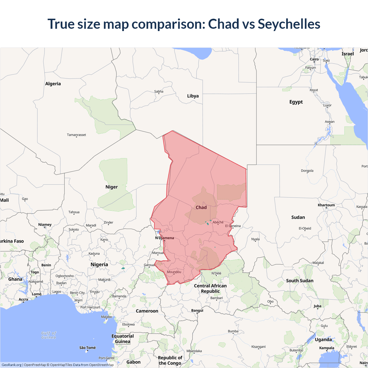 The map above outlines the borders of Chad and the Seychelles but is not accurate for size comparison because it's a 2d map with Mercator projection that distorts territories near the poles. The farther a country is from the equator, the more magnified it appears. More about country size projections.
