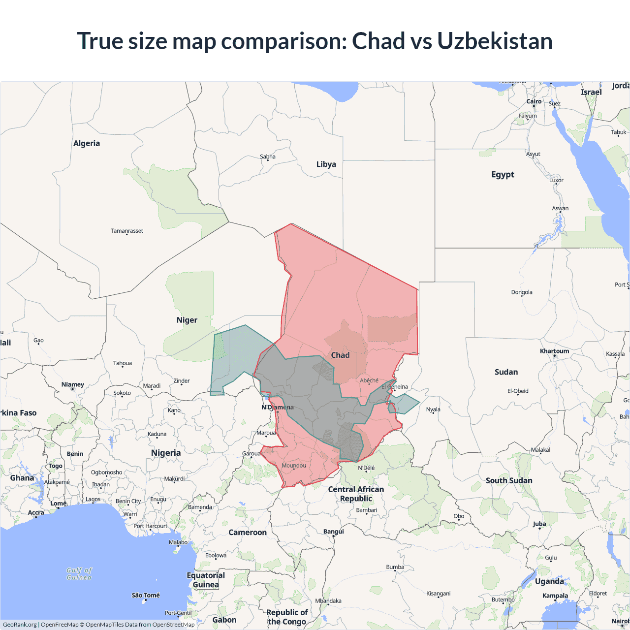 The map above outlines the borders of Chad and Uzbekistan but is not accurate for size comparison because it's a 2d map with Mercator projection that distorts territories near the poles. The farther a country is from the equator, the more magnified it appears. More about country size projections.