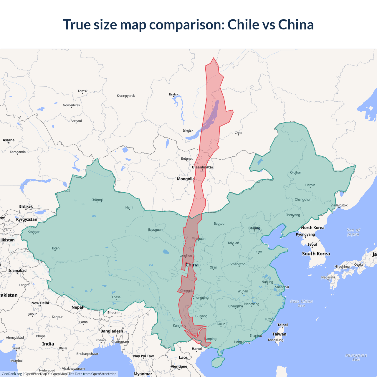 The map above outlines the borders of Chile and China but is not accurate for size comparison because it's a 2d map with Mercator projection that distorts territories near the poles. The farther a country is from the equator, the more magnified it appears. More about country size projections.