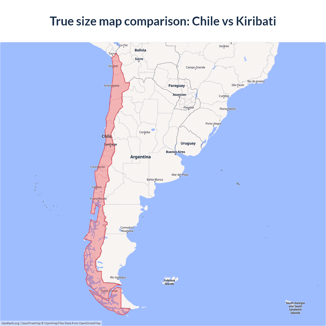 The map above outlines the borders of Chile and Kiribati but is not accurate for size comparison because it's a 2d map with Mercator projection that distorts territories near the poles. The farther a country is from the equator, the more magnified it appears. More about country size projections.