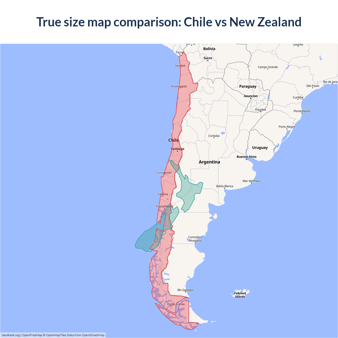 The map above outlines the borders of Chile and New Zealand but is not accurate for size comparison because it's a 2d map with Mercator projection that distorts territories near the poles. The farther a country is from the equator, the more magnified it appears. More about country size projections.