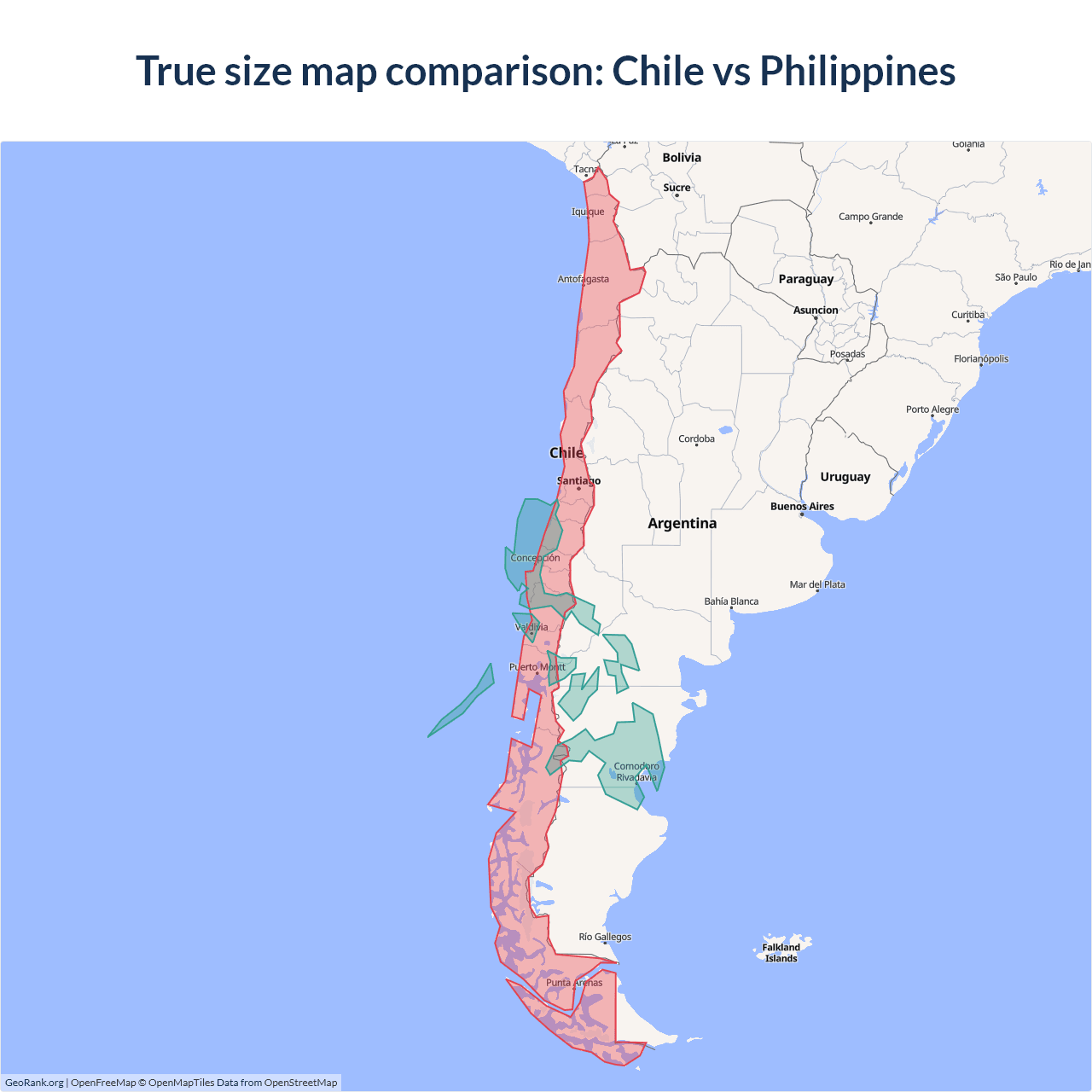 The map above outlines the borders of Chile and the Philippines but is not accurate for size comparison because it's a 2d map with Mercator projection that distorts territories near the poles. The farther a country is from the equator, the more magnified it appears. More about country size projections.