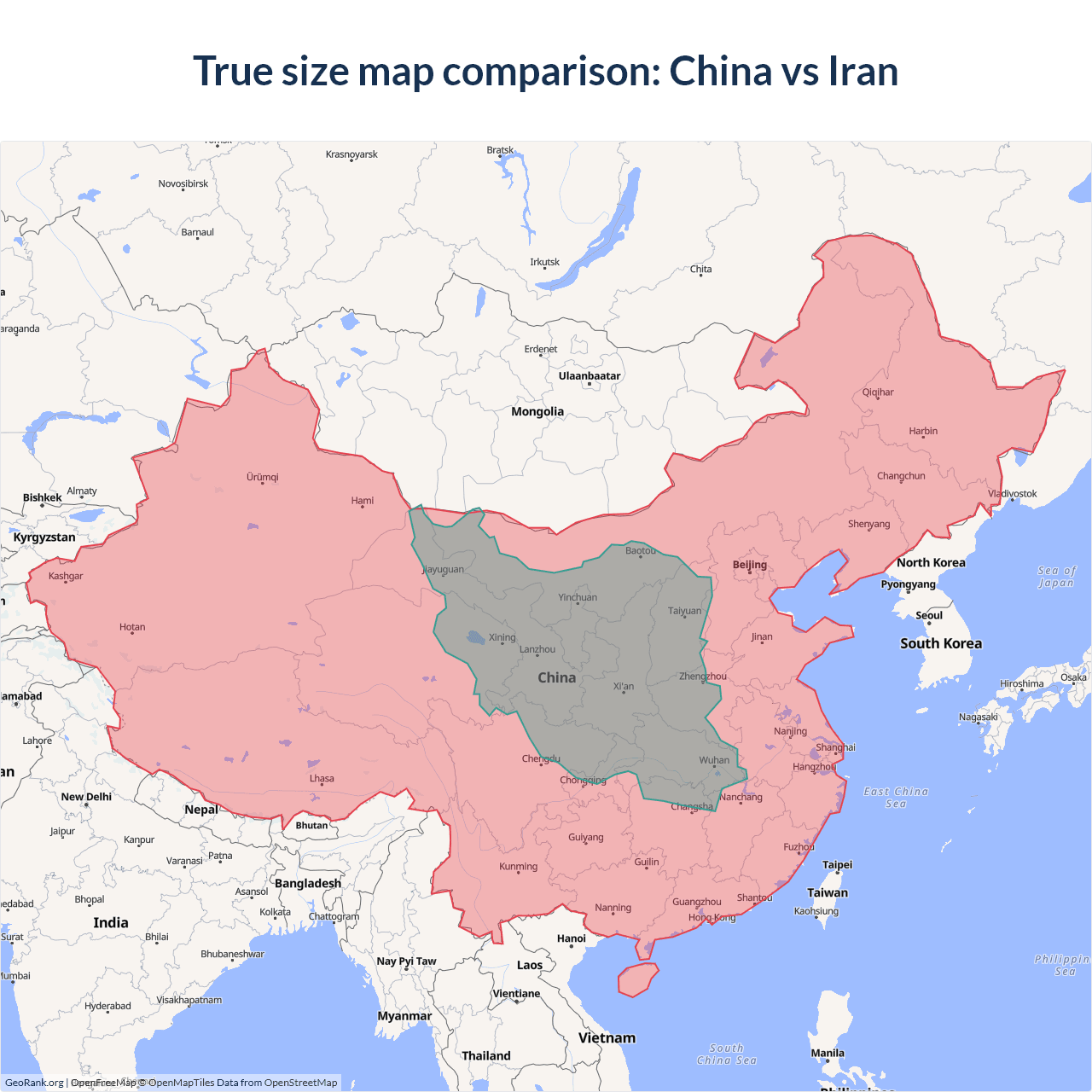 The map above outlines the borders of China and Iran but is not accurate for size comparison because it's a 2d map with Mercator projection that distorts territories near the poles. The farther a country is from the equator, the more magnified it appears. More about country size projections.