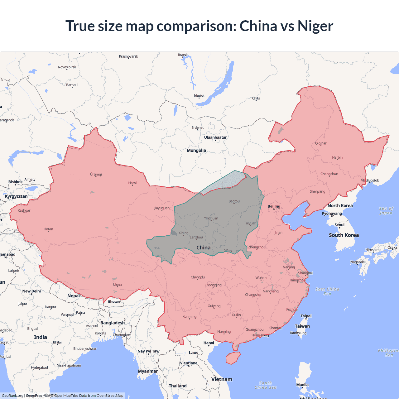 The map above outlines the borders of China and Niger but is not accurate for size comparison because it's a 2d map with Mercator projection that distorts territories near the poles. The farther a country is from the equator, the more magnified it appears. More about country size projections.