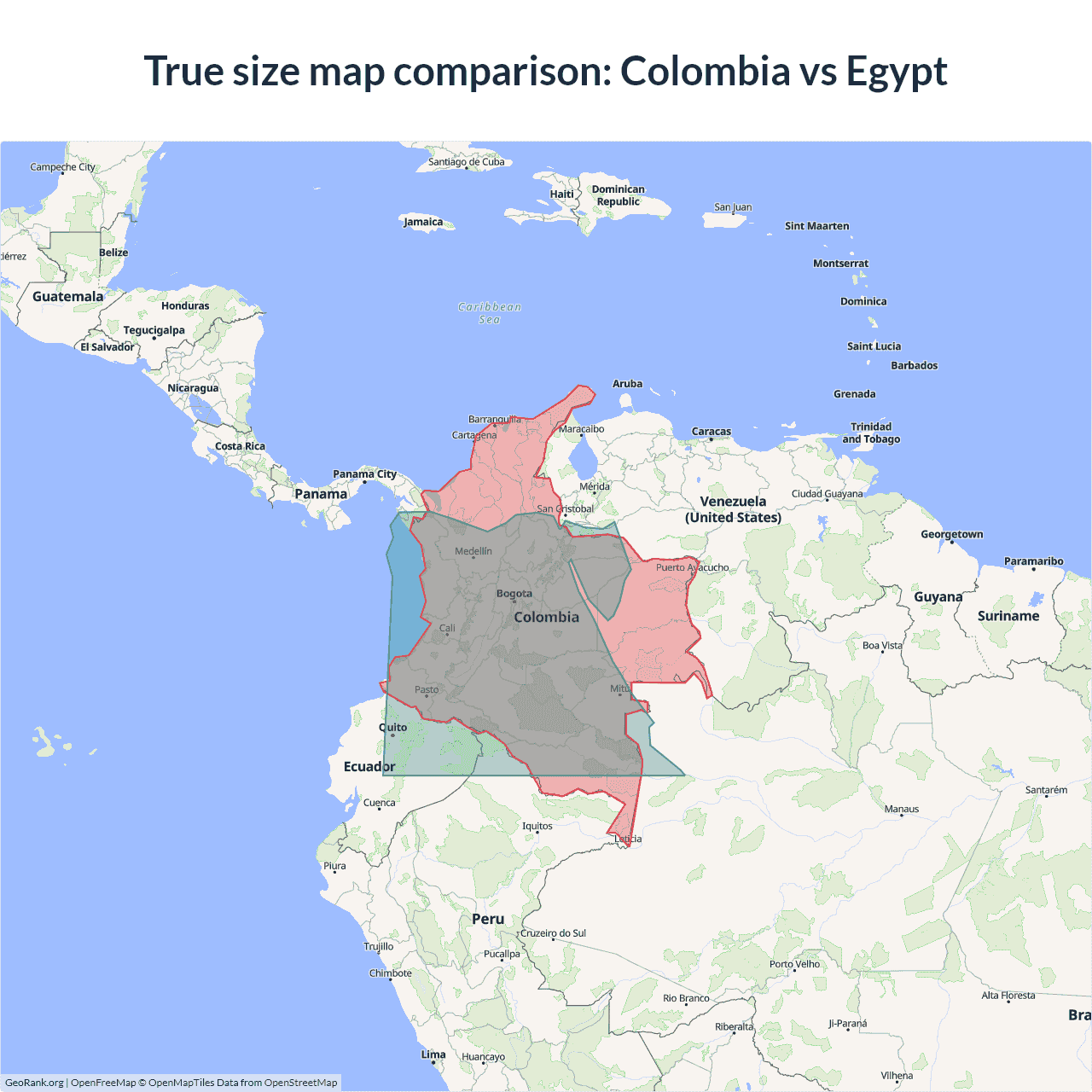 The map above outlines the borders of Colombia and Egypt but is not accurate for size comparison because it's a 2d map with Mercator projection that distorts territories near the poles. The farther a country is from the equator, the more magnified it appears. More about country size projections.