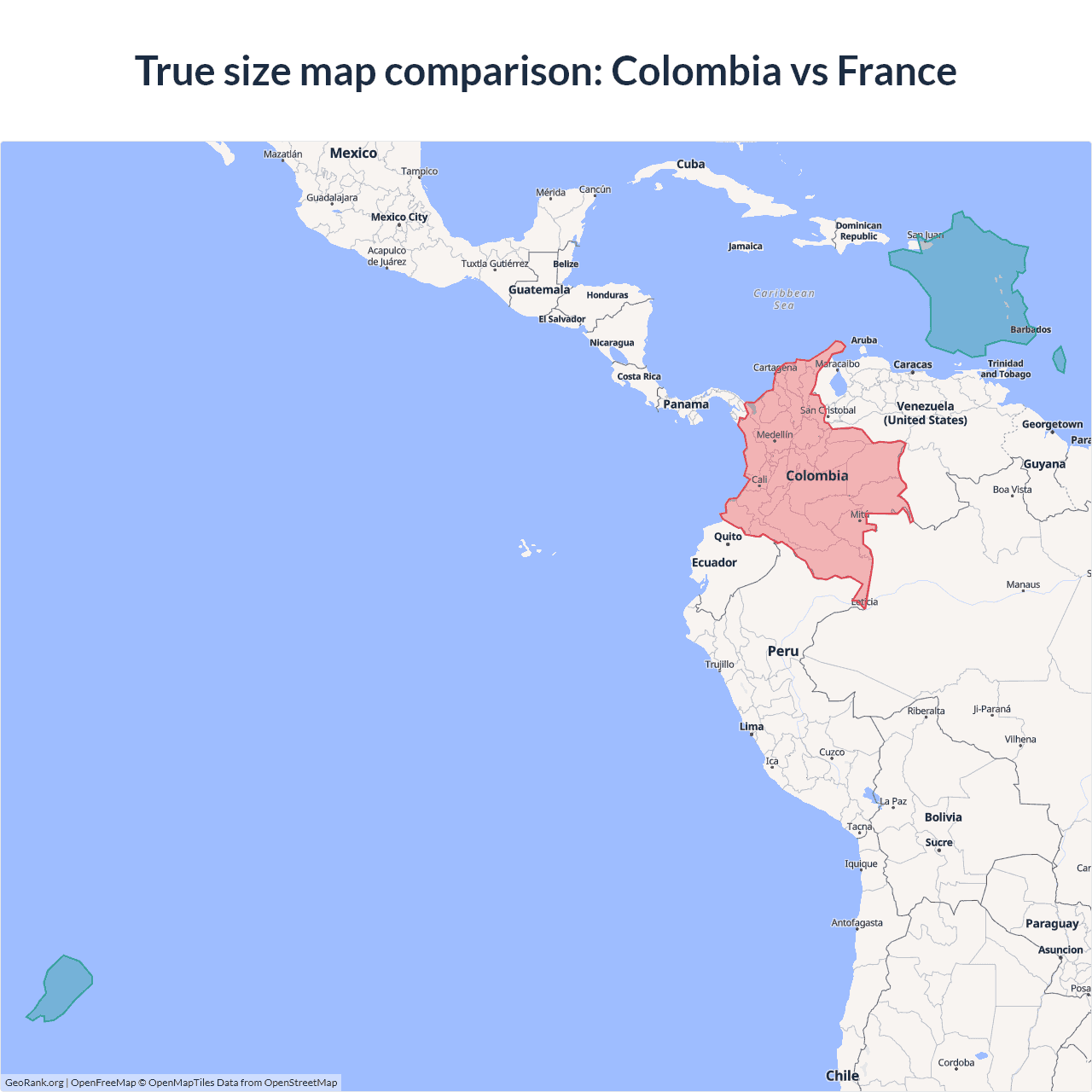 The map above outlines the borders of Colombia and France but is not accurate for size comparison because it's a 2d map with Mercator projection that distorts territories near the poles. The farther a country is from the equator, the more magnified it appears. More about country size projections.