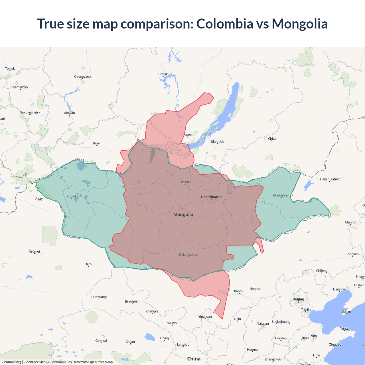 The map above outlines the borders of Colombia and Mongolia but is not accurate for size comparison because it's a 2d map with Mercator projection that distorts territories near the poles. The farther a country is from the equator, the more magnified it appears. More about country size projections.