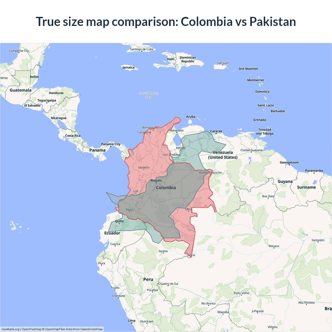 The map above outlines the borders of Colombia and Pakistan but is not accurate for size comparison because it's a 2d map with Mercator projection that distorts territories near the poles. The farther a country is from the equator, the more magnified it appears. More about country size projections.