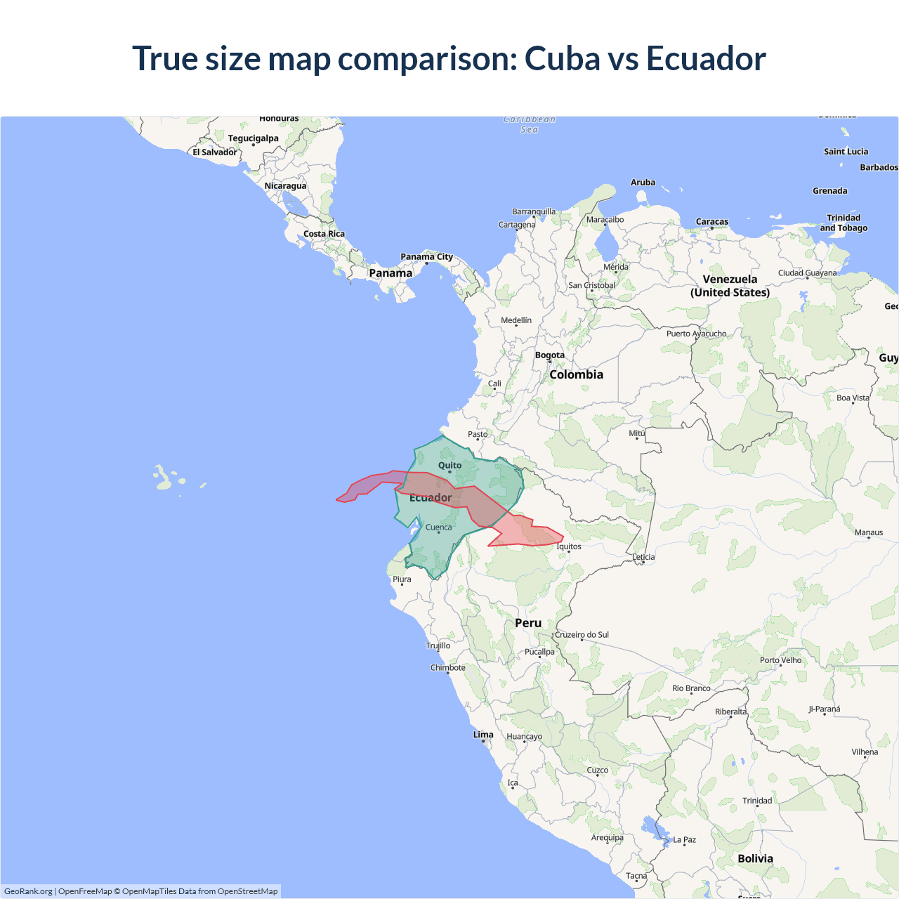 The map above outlines the borders of Cuba and Ecuador but is not accurate for size comparison because it's a 2d map with Mercator projection that distorts territories near the poles. The farther a country is from the equator, the more magnified it appears. More about country size projections.
