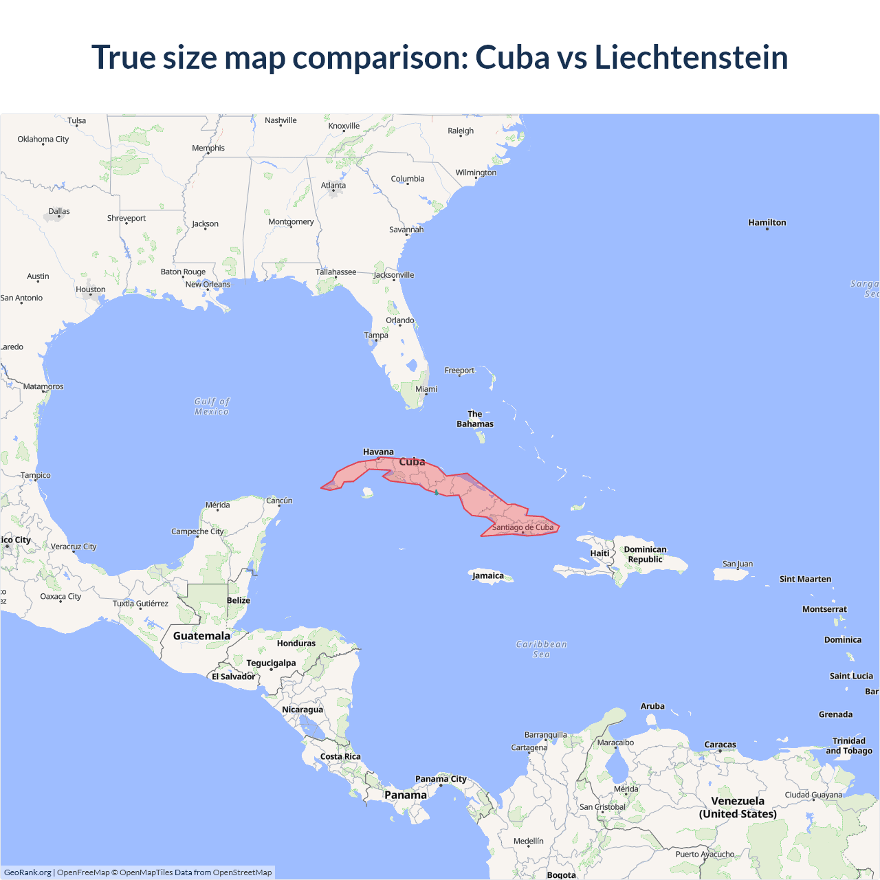 The map above outlines the borders of Cuba and Liechtenstein but is not accurate for size comparison because it's a 2d map with Mercator projection that distorts territories near the poles. The farther a country is from the equator, the more magnified it appears. More about country size projections.