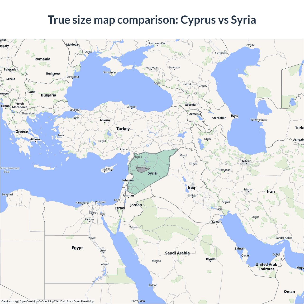 The map above outlines the borders of Cyprus and Syria but is not accurate for size comparison because it's a 2d map with Mercator projection that distorts territories near the poles. The farther a country is from the equator, the more magnified it appears. More about country size projections.