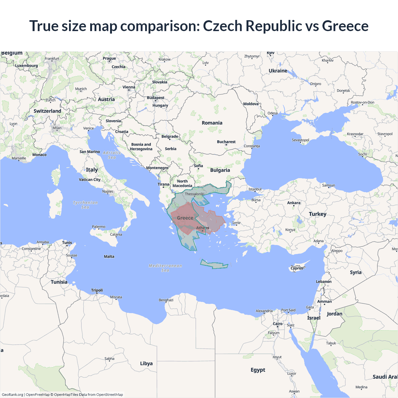 The map above outlines the borders of the Czech Republic and Greece but is not accurate for size comparison because it's a 2d map with Mercator projection that distorts territories near the poles. The farther a country is from the equator, the more magnified it appears. More about country size projections.