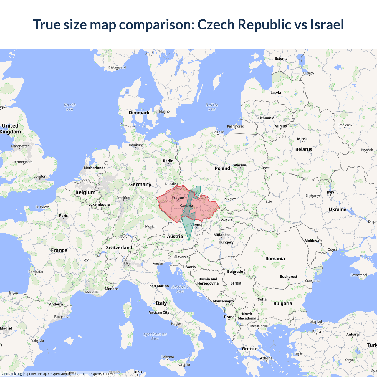 The map above outlines the borders of the Czech Republic and Israel but is not accurate for size comparison because it's a 2d map with Mercator projection that distorts territories near the poles. The farther a country is from the equator, the more magnified it appears. More about country size projections.