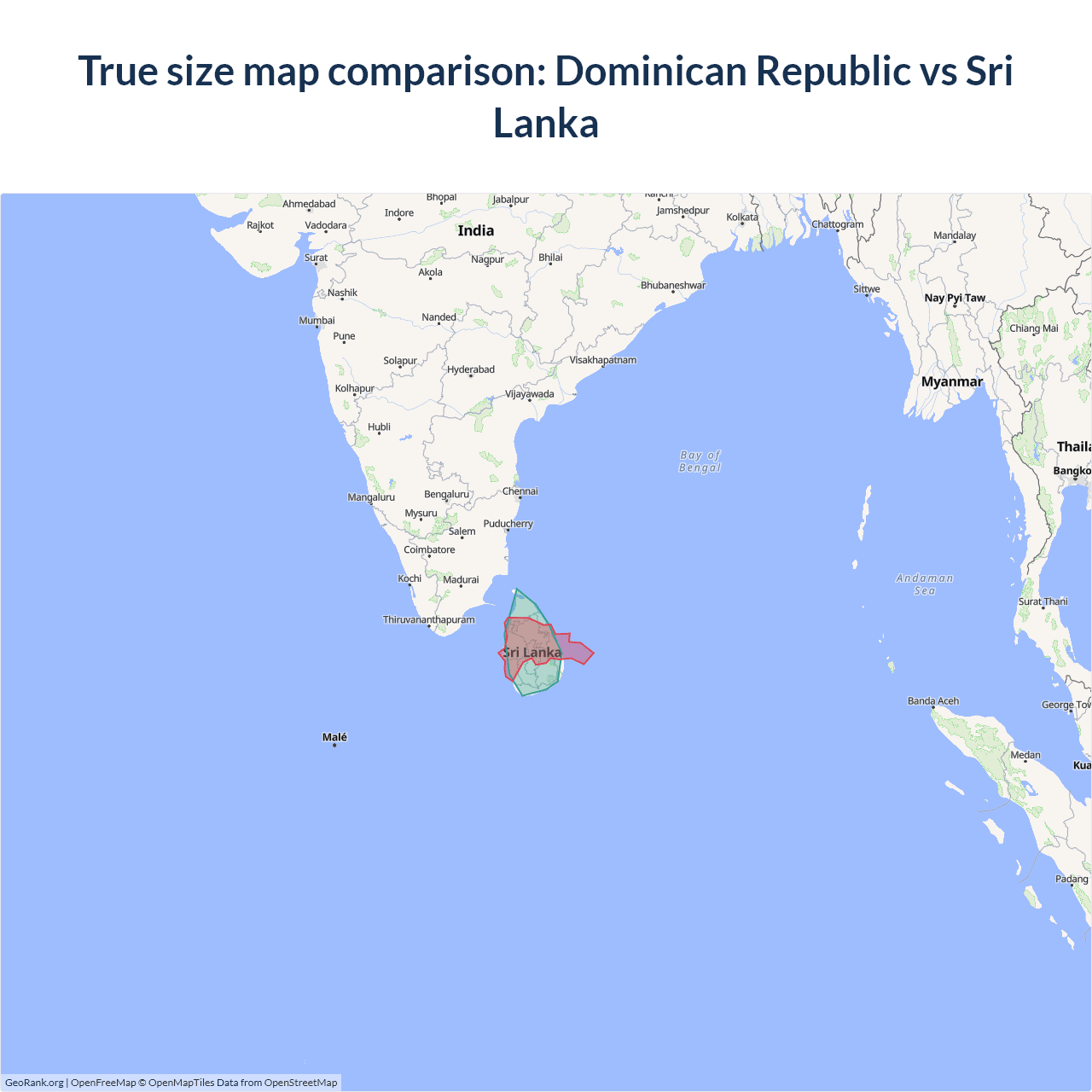 The map above outlines the borders of the Dominican Republic and Sri Lanka but is not accurate for size comparison because it's a 2d map with Mercator projection that distorts territories near the poles. The farther a country is from the equator, the more magnified it appears. More about country size projections.