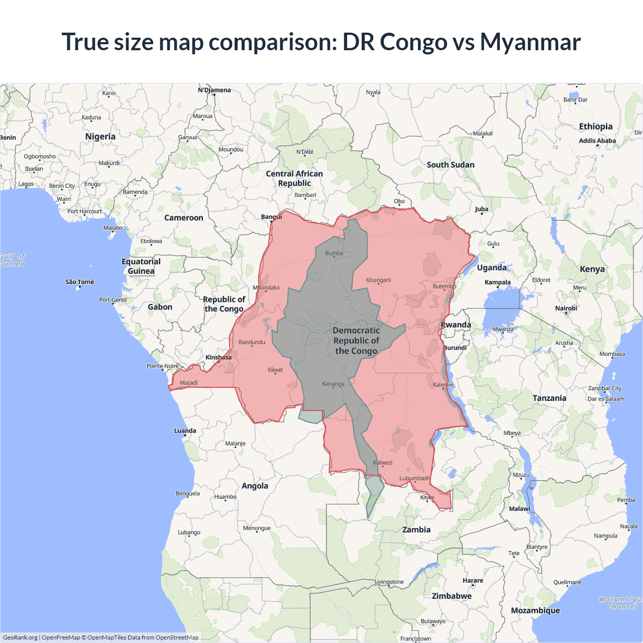 The map above outlines the borders of the DR Congo and Myanmar but is not accurate for size comparison because it's a 2d map with Mercator projection that distorts territories near the poles. The farther a country is from the equator, the more magnified it appears. More about country size projections.