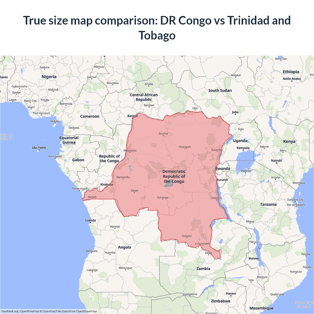 The map above outlines the borders of the DR Congo and Trinidad and Tobago but is not accurate for size comparison because it's a 2d map with Mercator projection that distorts territories near the poles. The farther a country is from the equator, the more magnified it appears. More about country size projections.