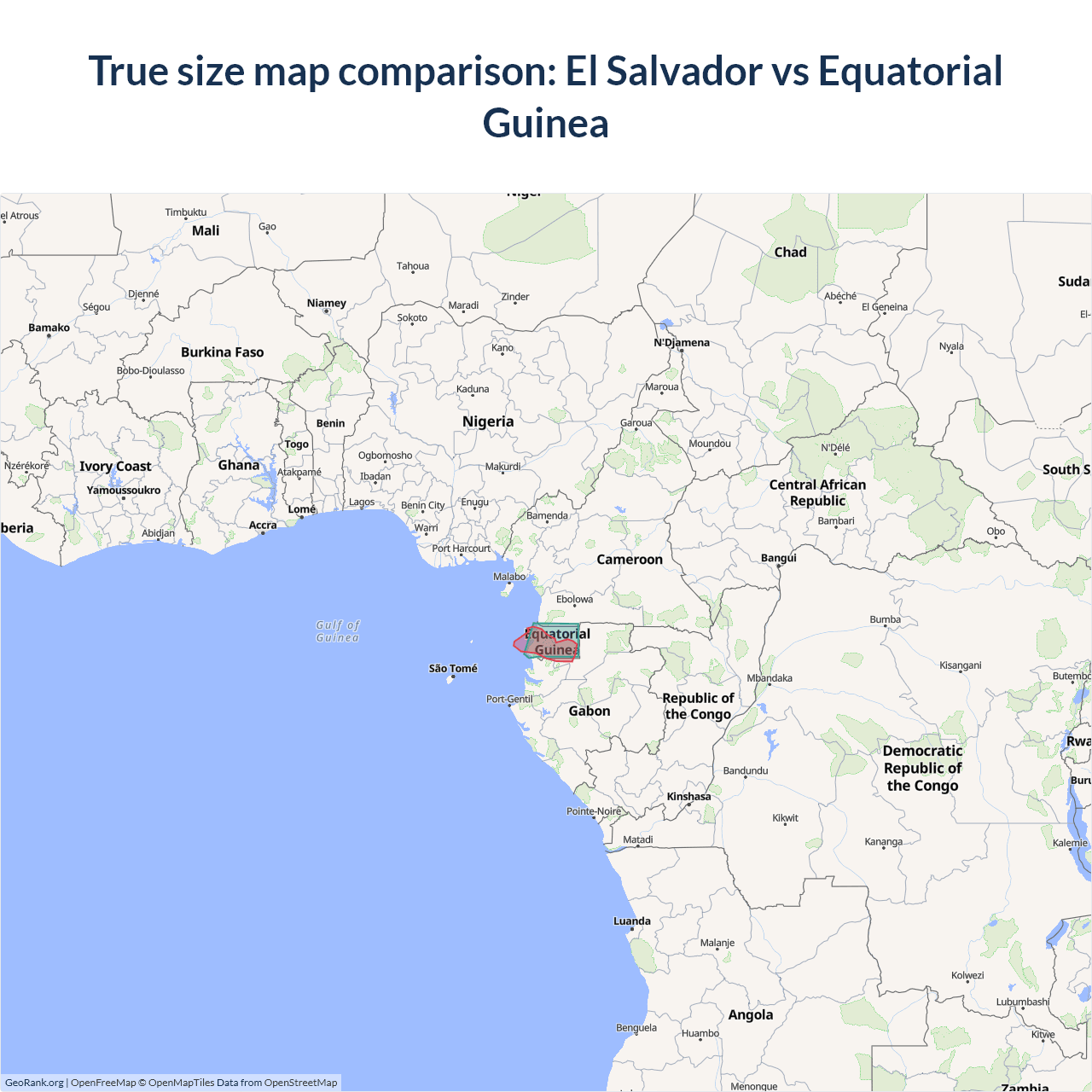 The map above outlines the borders of El Salvador and Equatorial Guinea but is not accurate for size comparison because it's a 2d map with Mercator projection that distorts territories near the poles. The farther a country is from the equator, the more magnified it appears. More about country size projections.