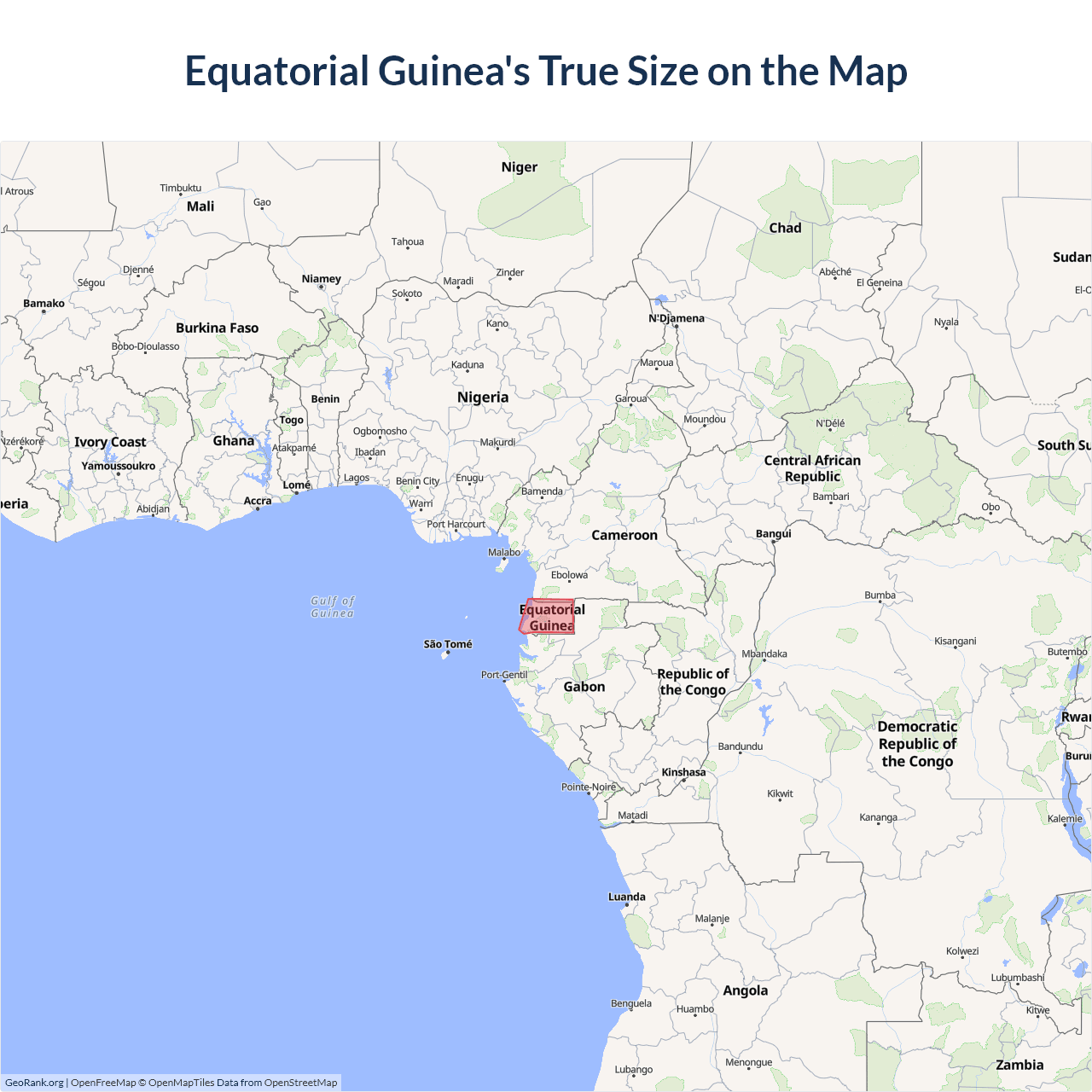 The map above outlines the borders of Equatorial Guinea but is not accurate for size comparison because it's a 2d map with Mercator projection that distorts territories near the poles. The farther a country is from the equator, the more magnified it appears. More about country size projections.