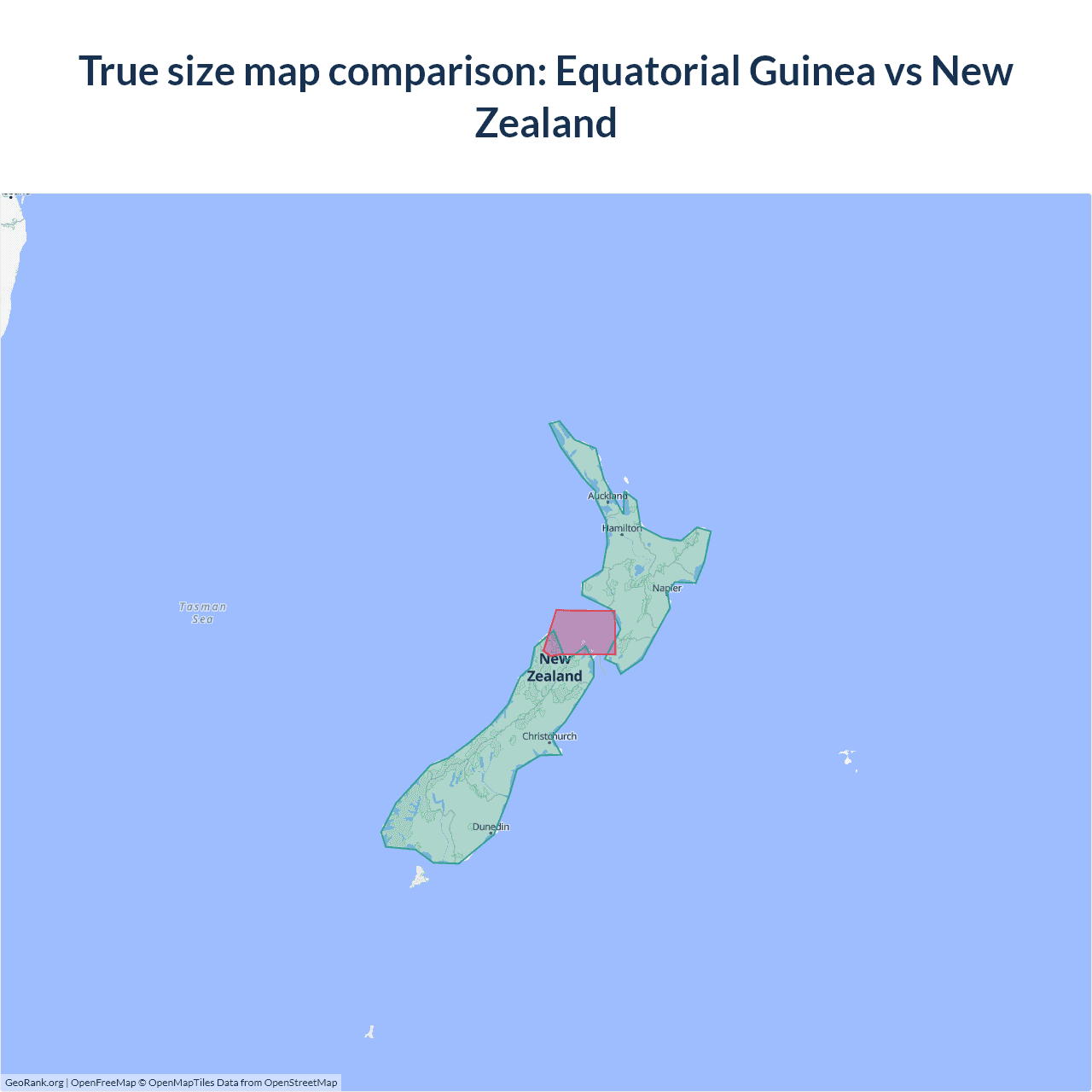 The map above outlines the borders of Equatorial Guinea and New Zealand but is not accurate for size comparison because it's a 2d map with Mercator projection that distorts territories near the poles. The farther a country is from the equator, the more magnified it appears. More about country size projections.